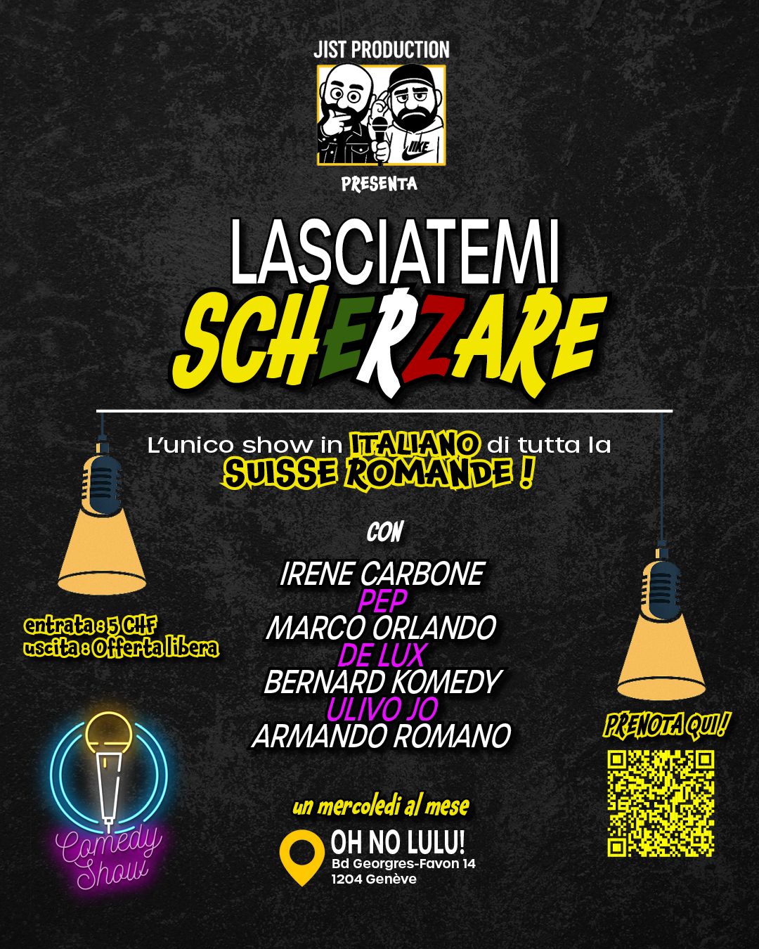 Lasciatemi Scherzare è un collettivo nato nel 2023 con l’obiettivo di portare l'umorismo italiano in Svizzera Romanda. Ideato da Stefano (detto Stè) e Jonathan (detto Jo), fondatori del JiSt Comedy, il progetto ha subito visto l'adesione entusiasta di Alessandro (De Lux), Giuseppe (Pep) e Marco, che hanno immediatamente portato le loro idee e il loro talento.